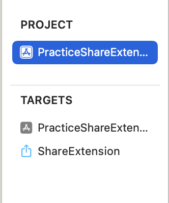 Share Extension을 다뤄본 글에서 XCode의 File - New - Target을 통해 Share Extension을 추가해본 적이 있는데요, 그러면 위의 그림과 같이 하나의 프로젝트(PracticeShareExtension)에 두 개의 타겟(PracticeShareExtension과 ShareExtension)이 있는 것을 볼 수있습니다.