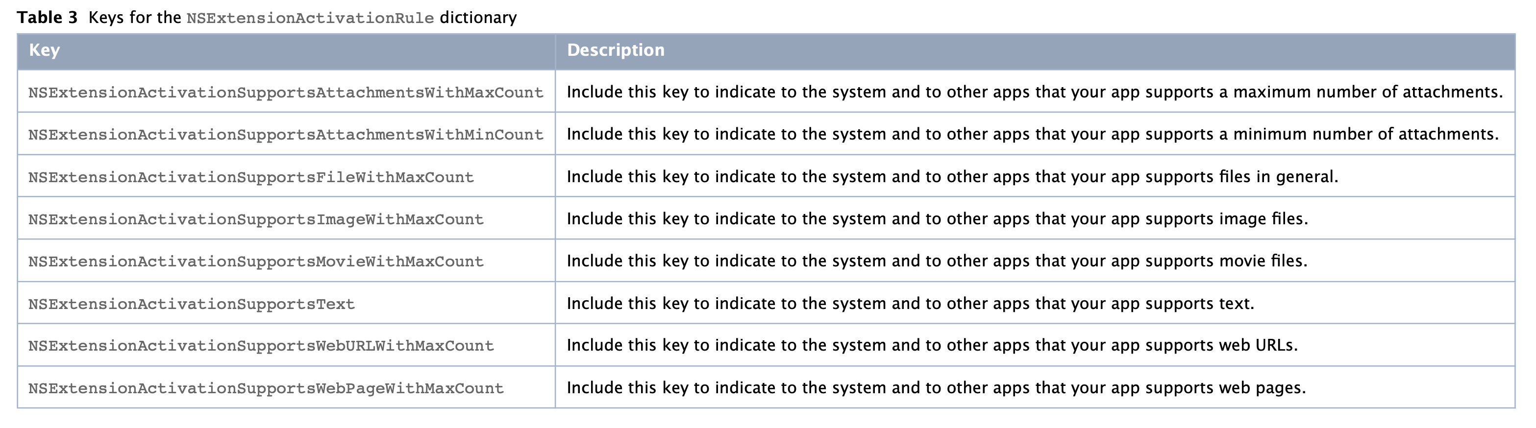 이것을 설정하게 되면 Share Extension이 필요한 앱의 공유 시트에서만 자신의 앱이 나타나도록 할 수 있거나 특정 조건을 만족해야만 자신의 앱이 공유 시트에 나타나도록 설정할 수 있습니다.