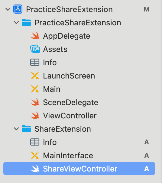 그러면 다음과 같이 새로운 폴더와 함께 기본적인 ShareViewController, Info.plist 파일, 인터페이스 파일(스토리보드)를 제공해줍니다.