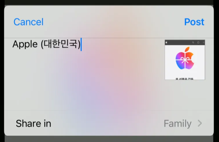 iOS에서는 preview를 공유 UI의 텍스트 편집 영역 옆에 표시합니다. 가능한 한 작은 preview를 만들어 텍스트 영역이 지나치게 작아지지 않도록 해야 합니다. Share UI는 높이를 확장할 수 있지만, 지나치게 높아지면 콘텐츠가 키보드 뒤에 표시되어 사용자가 스크롤해야 할 수 있습니다.