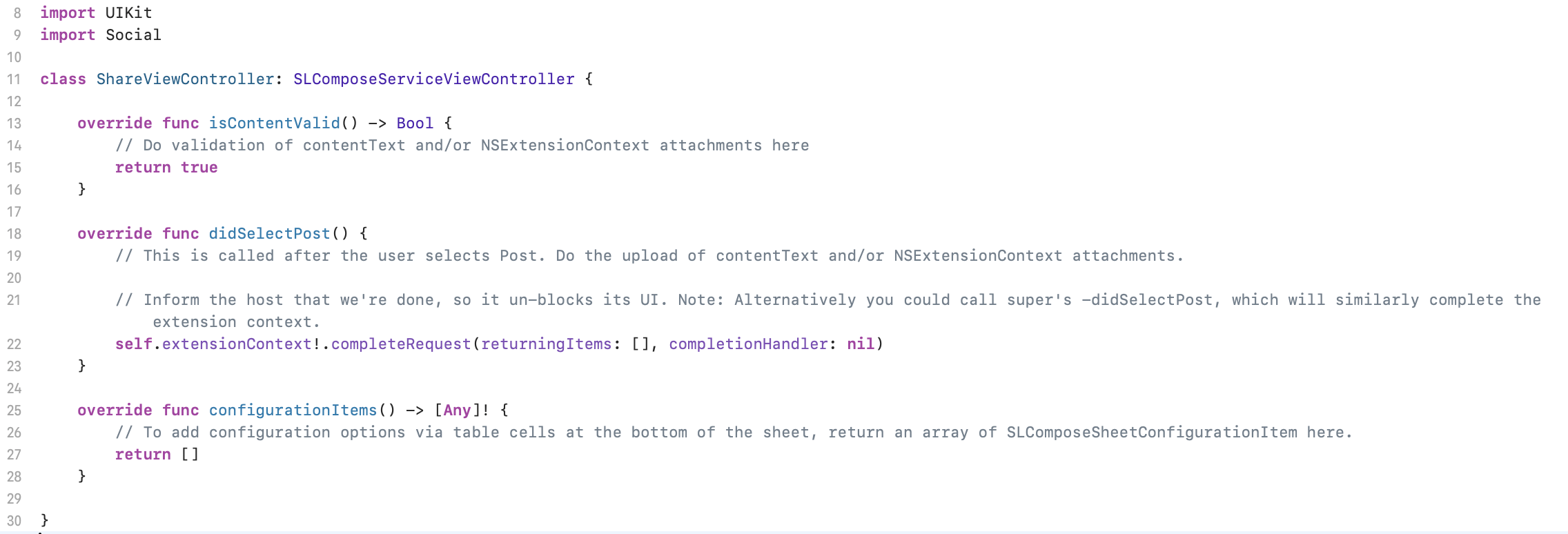 먼저 기본적인 ShareViewController는 다음과 같은 모습입니다.