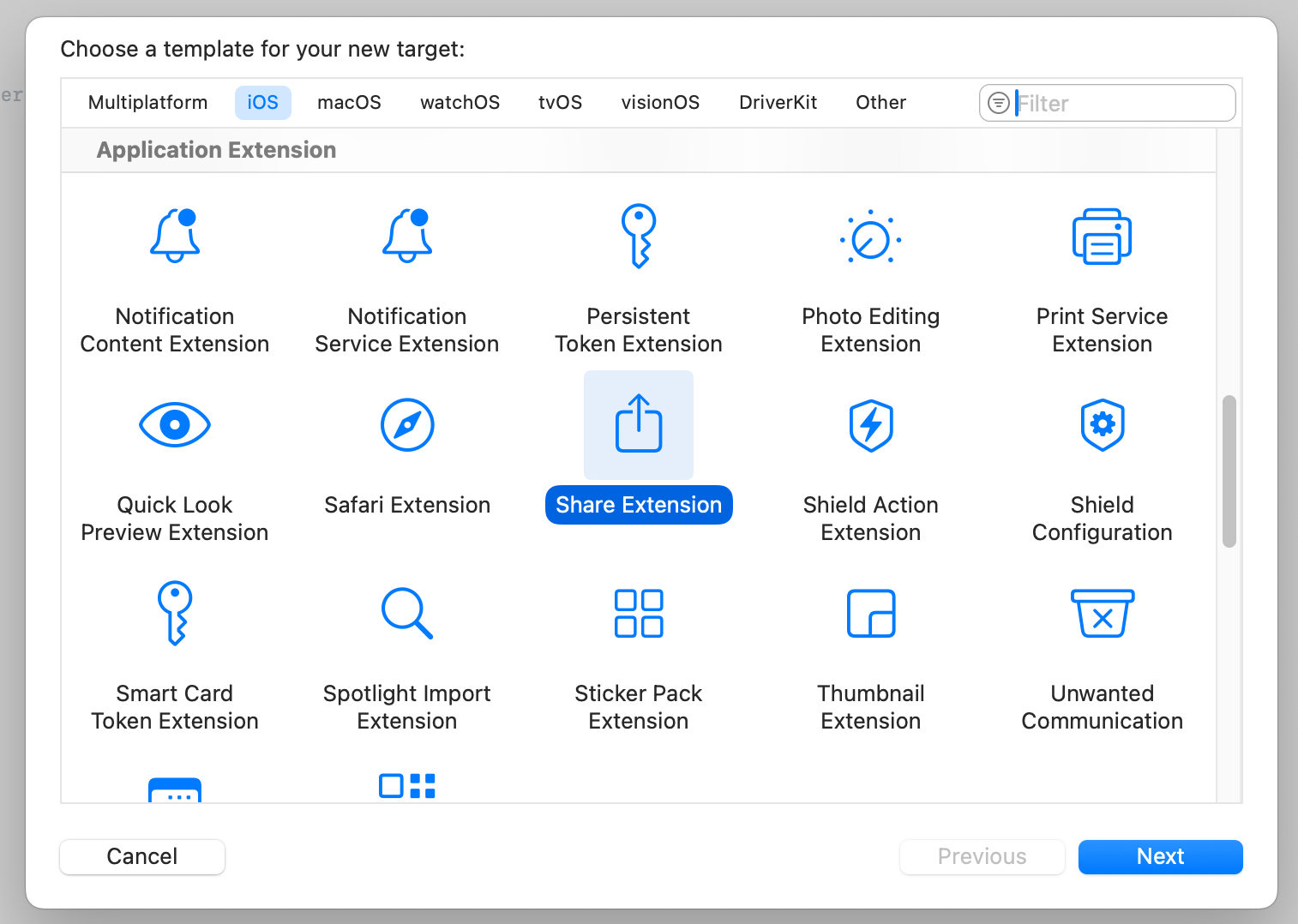 그러면 위와 같이 다양한 Extension들이 나오는데 이 중 Share Extension을 선택해주면 됩니다.