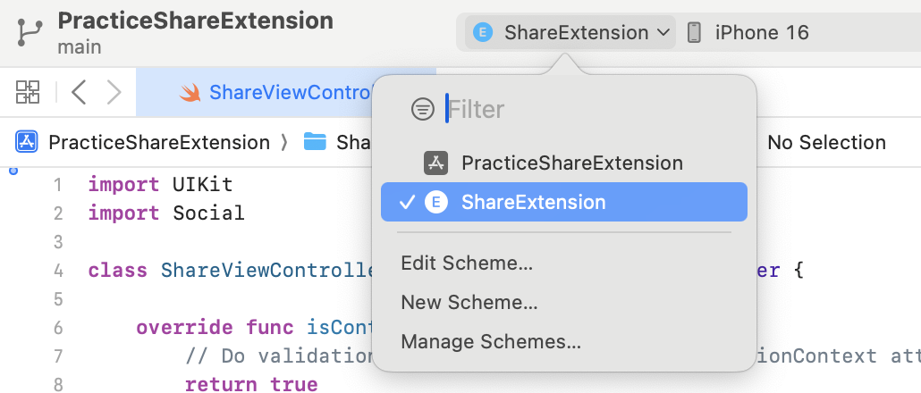 방금 만든 Share Extension을 선택해서 실행을 하면