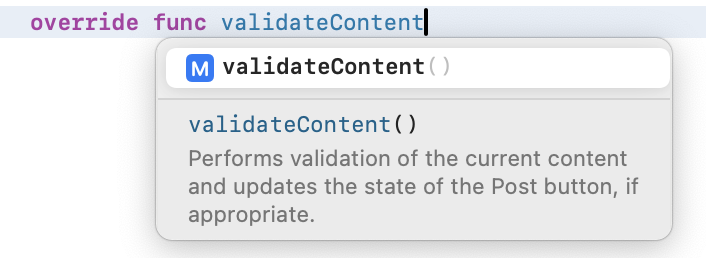 기본 Compose View Controller를 사용하는 경우(SLComposeServiceViewController를 상속받는 클래스를 사용하는 경우), 사용자가 현재 입력한 콘텐츠의 유효성을 확인하려면 isContentValid 메서드를 구현하면 됩니다. 사용자가 표준 Compose View에서 텍스트를 변경하면 시스템이 isContentValid 메서드를 구현하므로, 원하는 조건일 때 Post 버튼을 활성화 할 수 있습니다.