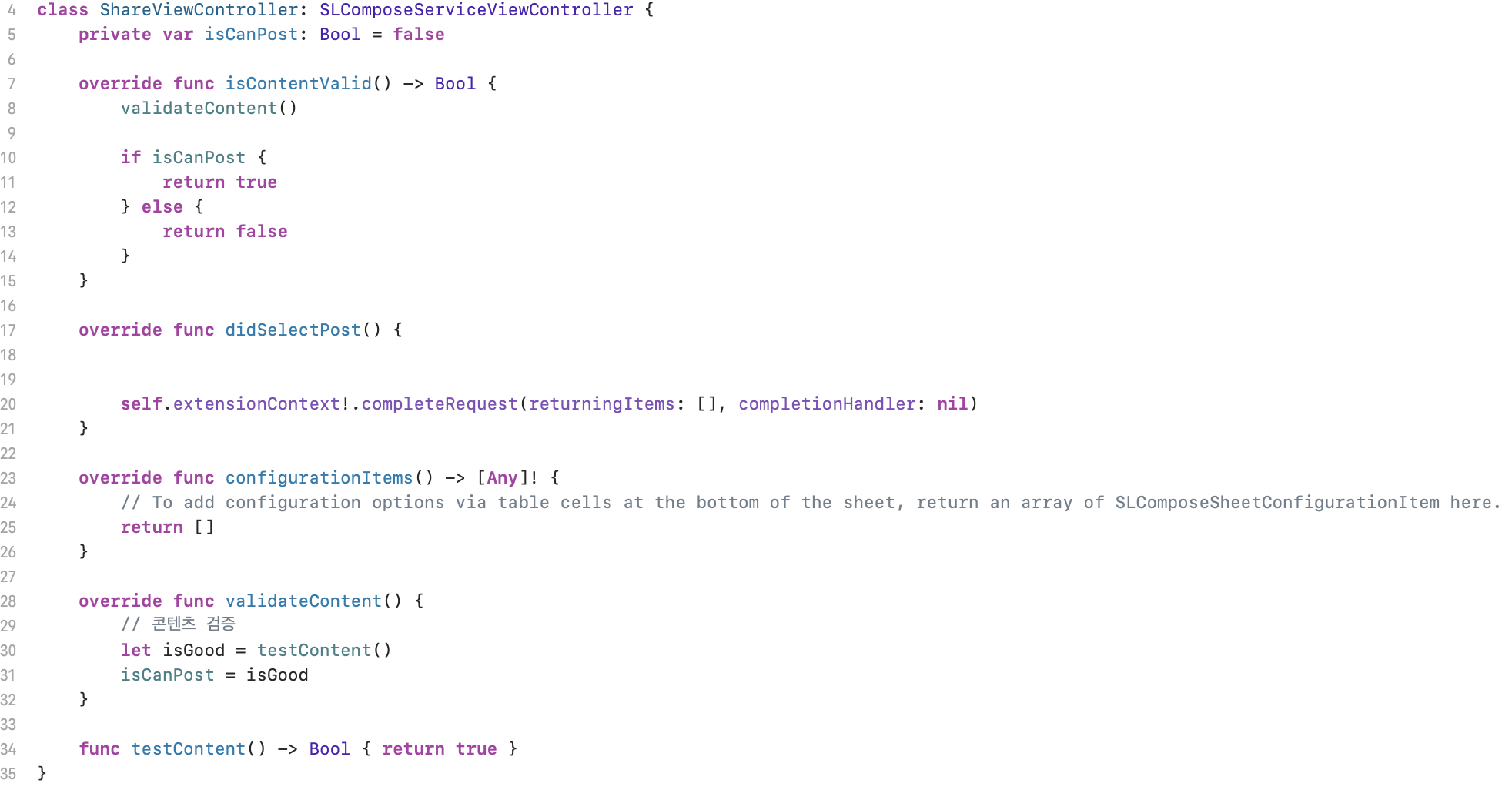 기본 Compose View Controller(SLComposeServiceViewController를 상속하는 ShareViewController)를 사용하면 위와 같이 validateContent() 메서드를 사용할 수 있습니다.