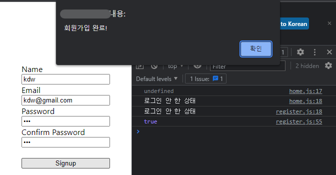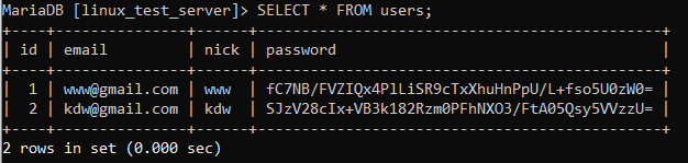 가입된 정보들이 정상적으로 mariaDB에 들어가는 걸 확인할 수 있다.