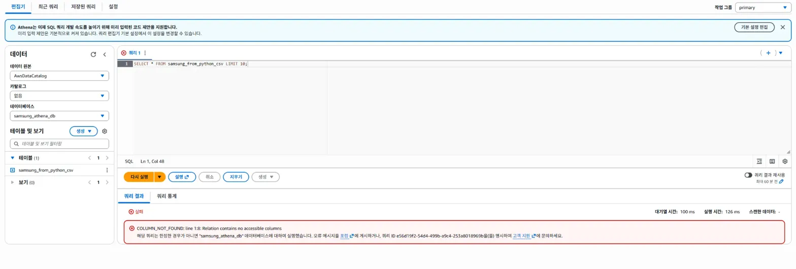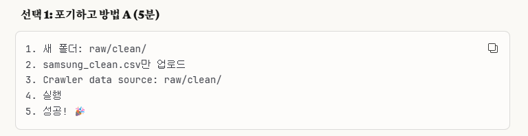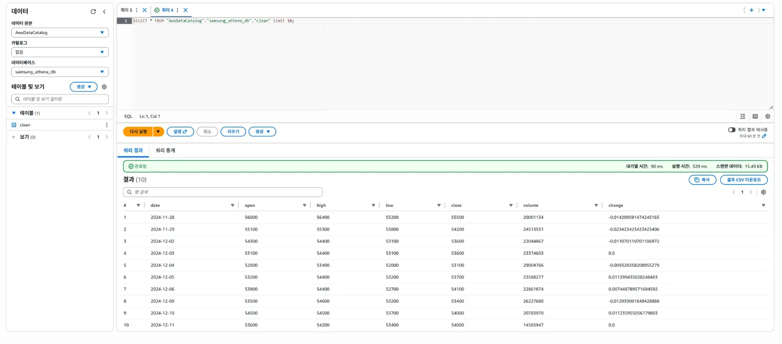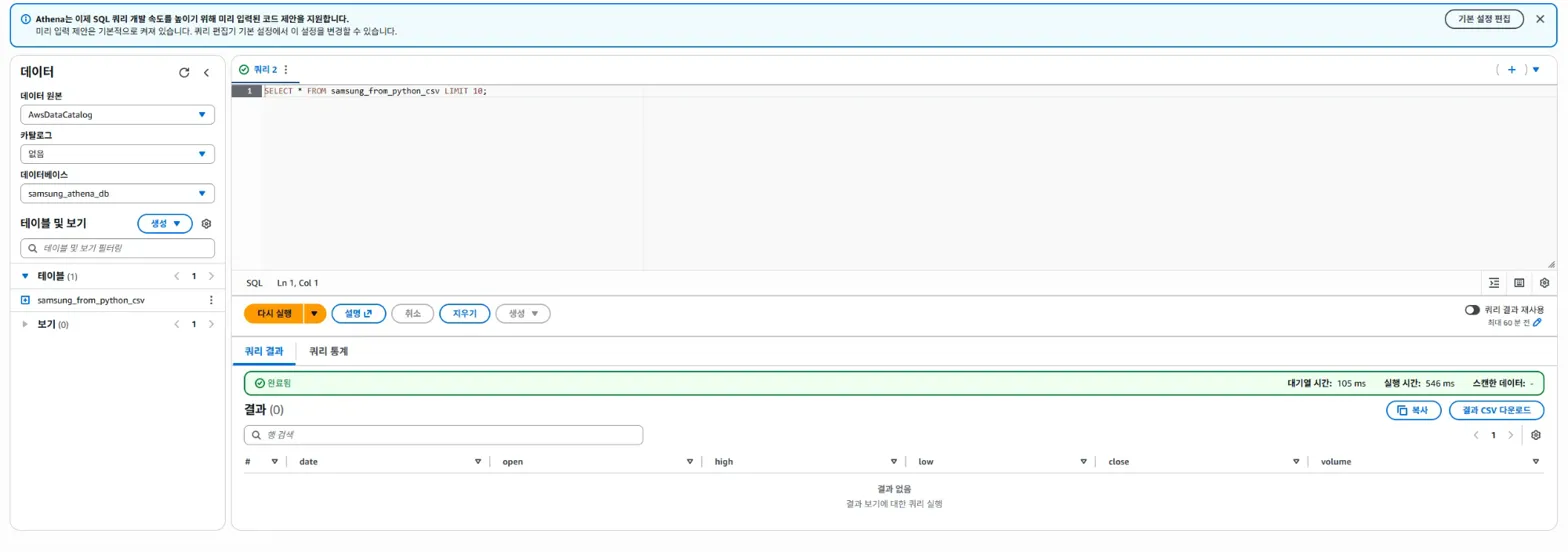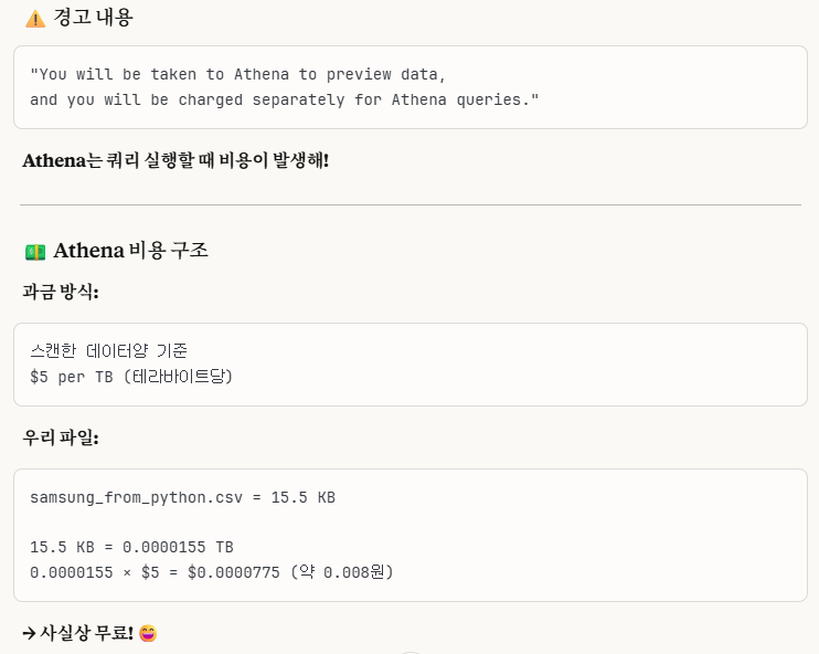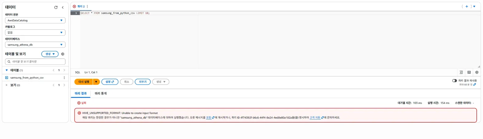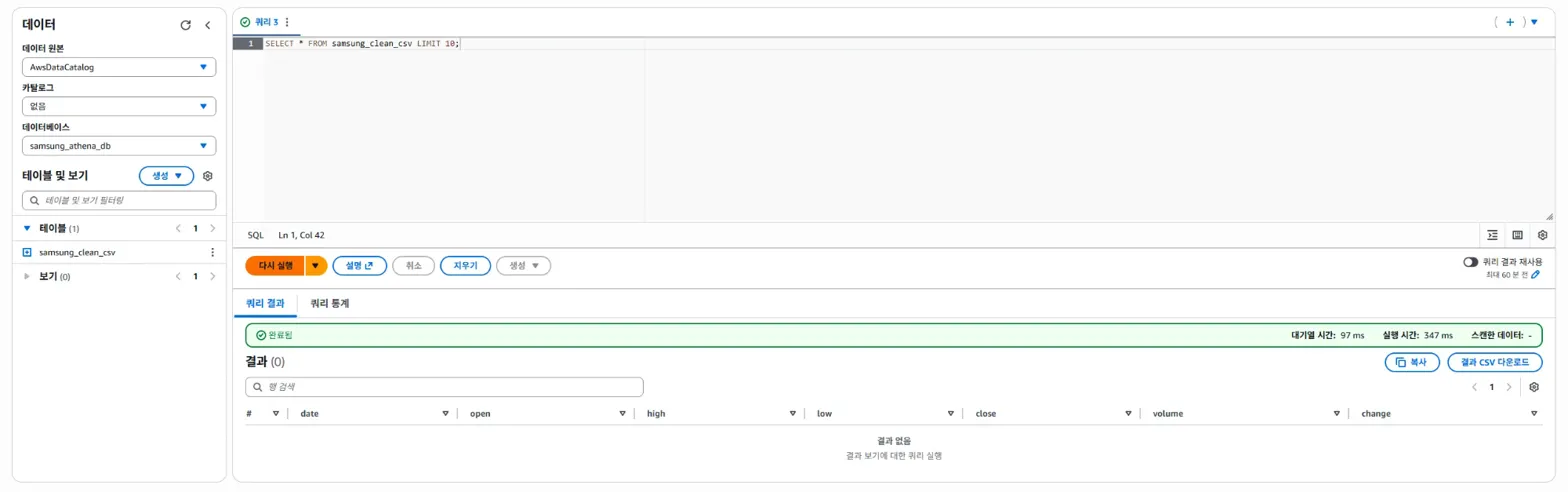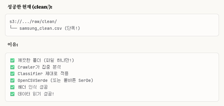 ->우리가 samsung_clean.csv를 파일이 아닌 폴더로 읽게 설정이 되어 있어서 빈 데이터로 나온 것임. 그래서 Athena SQL 쿼리문에서 실행을 해도 빈 값으로 나온 것이었음.2.AWS Crawler 및 Athena가 자동으로 잘 인식하게 설정하고 싶으면 S3 버킷에서 폴더 구조를 잘 정돈해서 만들어라(like clean/ 폴더 같이)