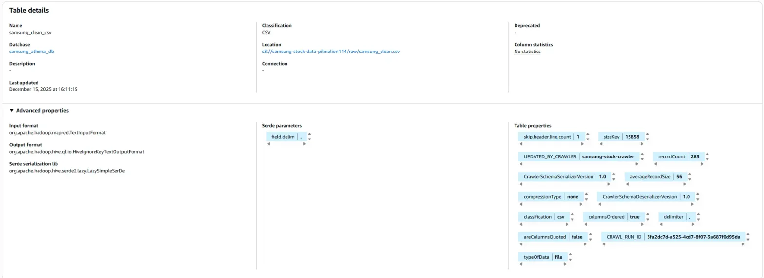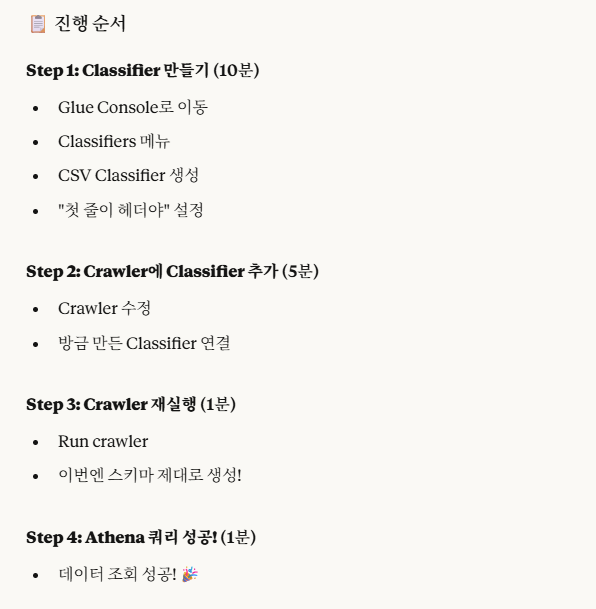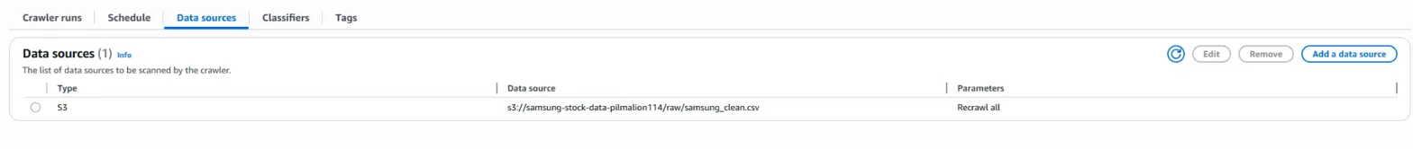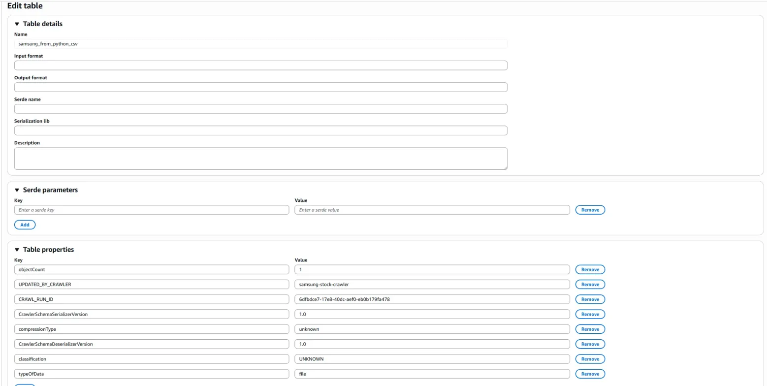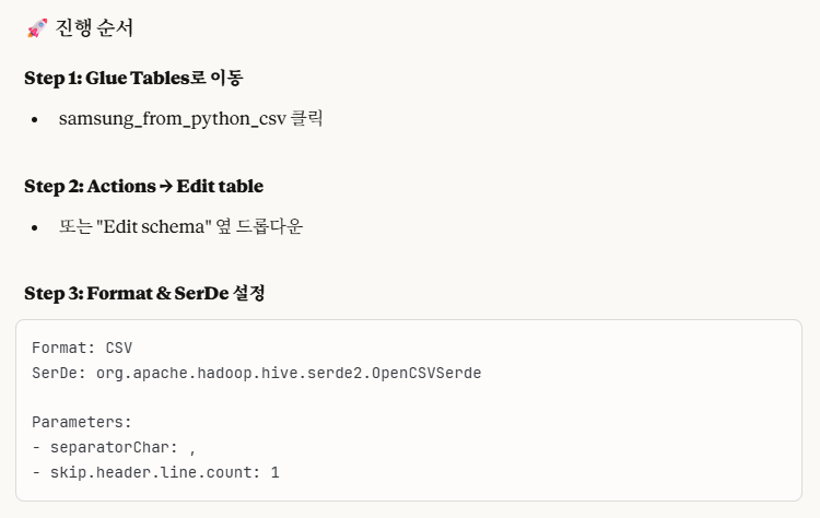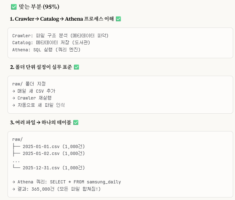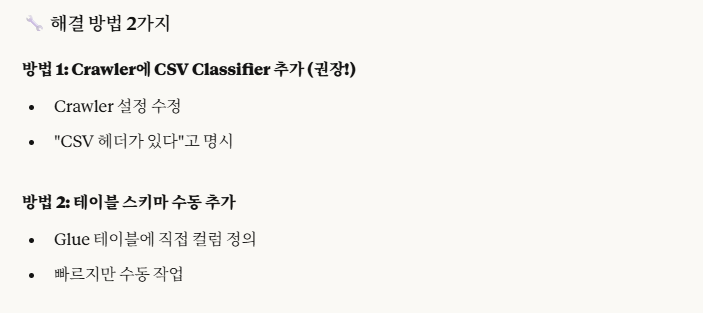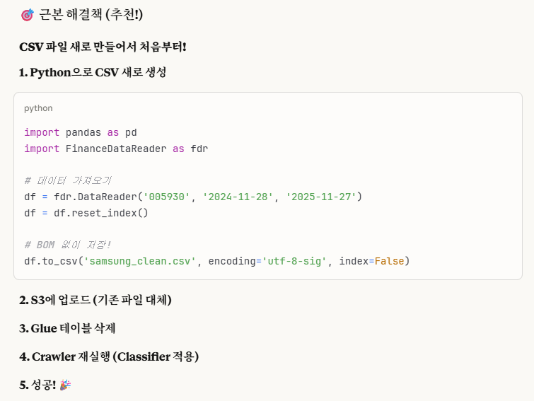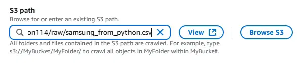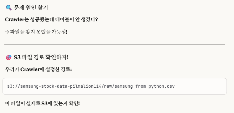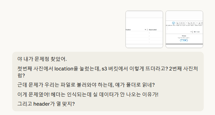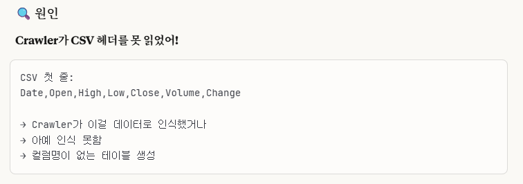 ->우리가 samsung_clean.csv를 파일이 아닌 폴더로 읽게 설정이 되어 있어서 빈 데이터로 나온 것임. 그래서 Athena SQL 쿼리문에서 실행을 해도 빈 값으로 나온 것이었음.2.AWS Crawler 및 Athena가 자동으로 잘 인식하게 설정하고 싶으면 S3 버킷에서 폴더 구조를 잘 정돈해서 만들어라(like clean/ 폴더 같이)