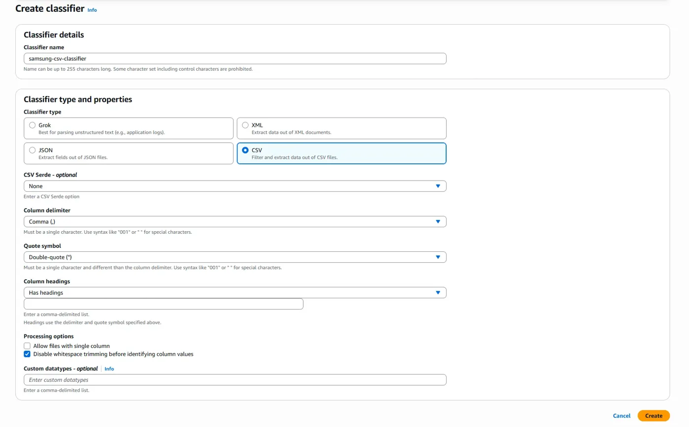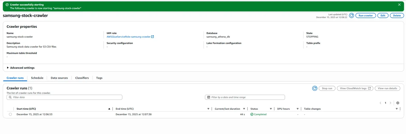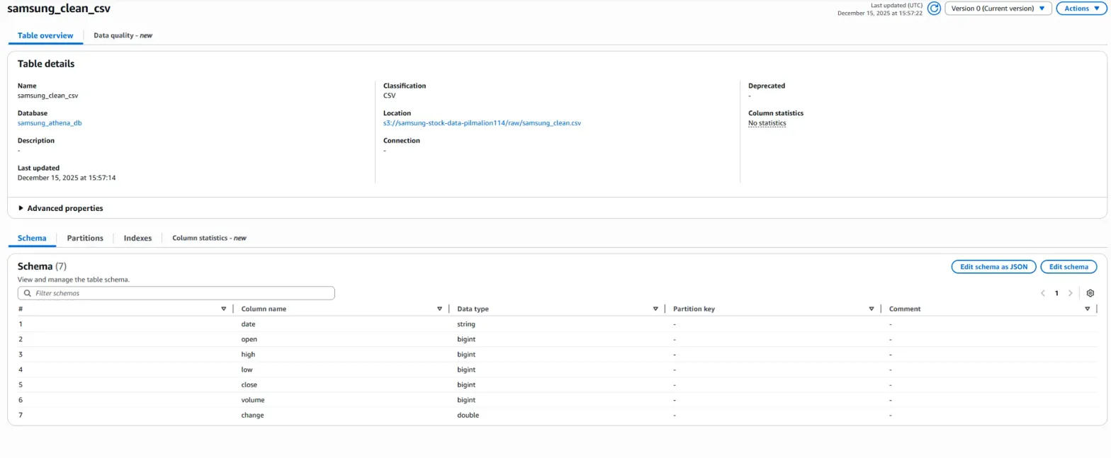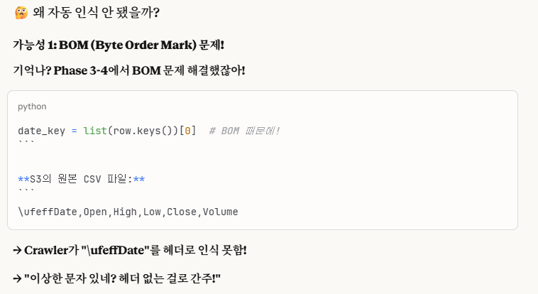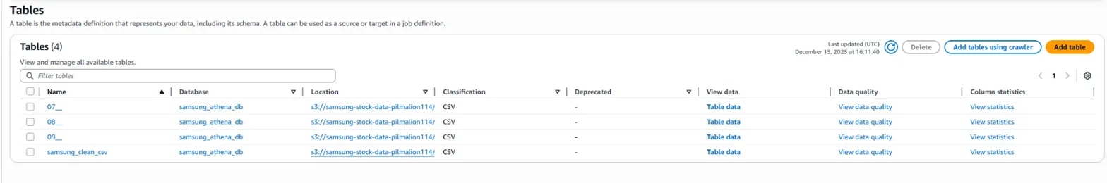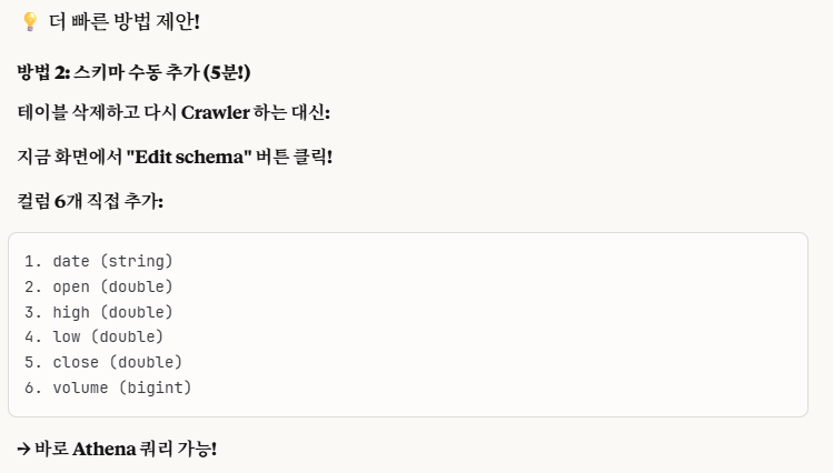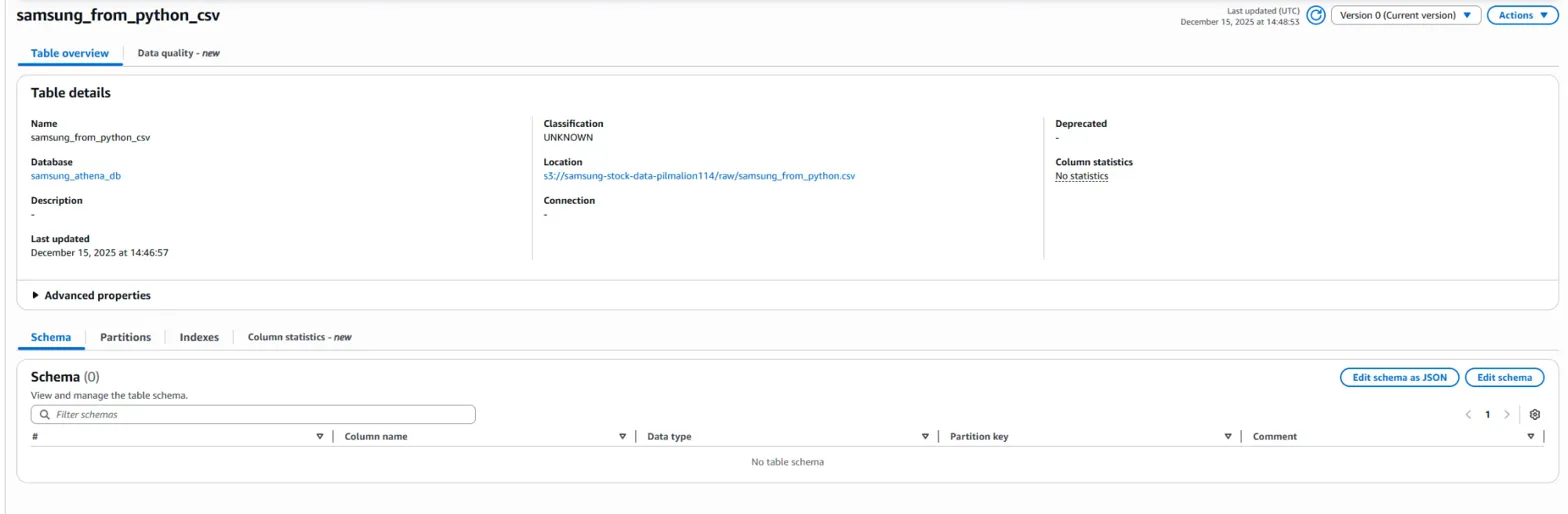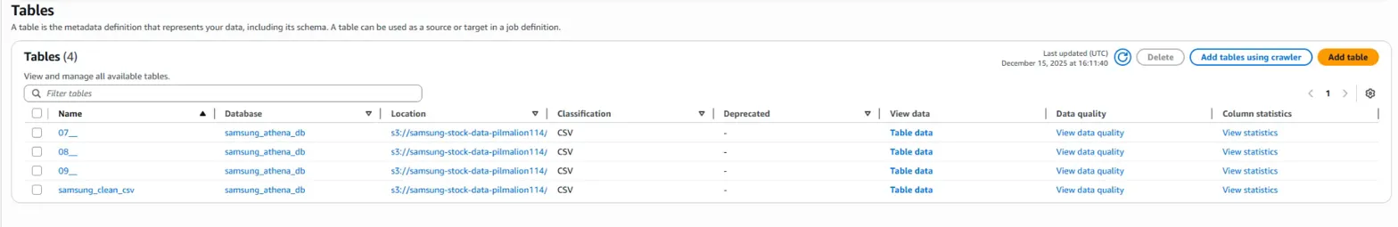->우리가 samsung_clean.csv를 파일이 아닌 폴더로 읽게 설정이 되어 있어서 빈 데이터로 나온 것임. 그래서 Athena SQL 쿼리문에서 실행을 해도 빈 값으로 나온 것이었음.2.AWS Crawler 및 Athena가 자동으로 잘 인식하게 설정하고 싶으면 S3 버킷에서 폴더 구조를 잘 정돈해서 만들어라(like clean/ 폴더 같이)