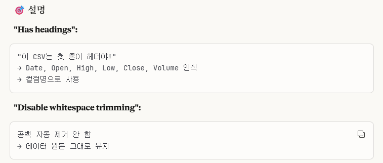 칼럼 구분자를 쉼표(,)로 구분하고, 첫 줄은 헤더이므로 건너뛰라는 설정입니다.