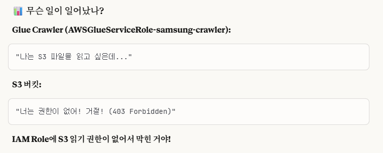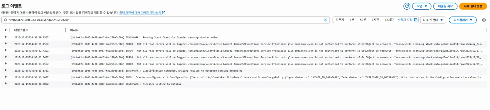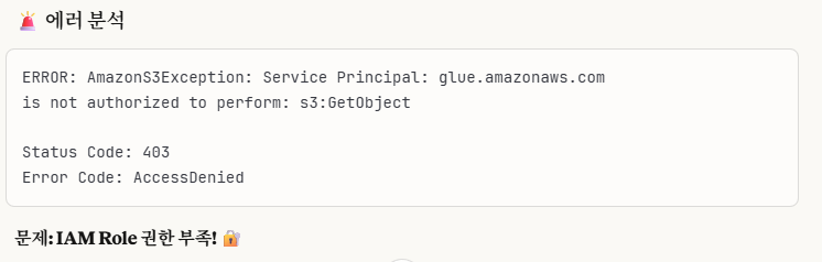 [b9bbaf2c-2b03-4e38-a0d7-fac259e3c68e] ERROR : Not all read errors will be logged. com.amazonaws.services.s3.model.AmazonS3Exception: Service Principal: glue.amazonaws.com is not authorized to perform: s3:GetObject on resource: "arn:aws:s3:::samsung-stock-data-pilmalion114/raw/samsung_from_python.csv" because no identity-based policy allows the s3:GetObject action (Service: Amazon S3; Status Code: 403; Error Code: AccessDenied; Request ID: MAEJQE2Q8M44PKVE; S3 Extended Request ID: /eCdMdby+aUM9gsC+z6lKtXX2P2BU42knPkWav1OuESP2yuUNNY+zm9bslI8r8kTC3PiOEigFkLko0/tttioDRPMyOTngg26; Proxy: null), S3 Extended Request ID: /eCdMdby+aUM9gsC+z6lKtXX2P2BU42knPkWav1OuESP2yuUNNY+zm9bslI8r8kTC3PiOEigFkLko0/tttioDRPMyOTngg26