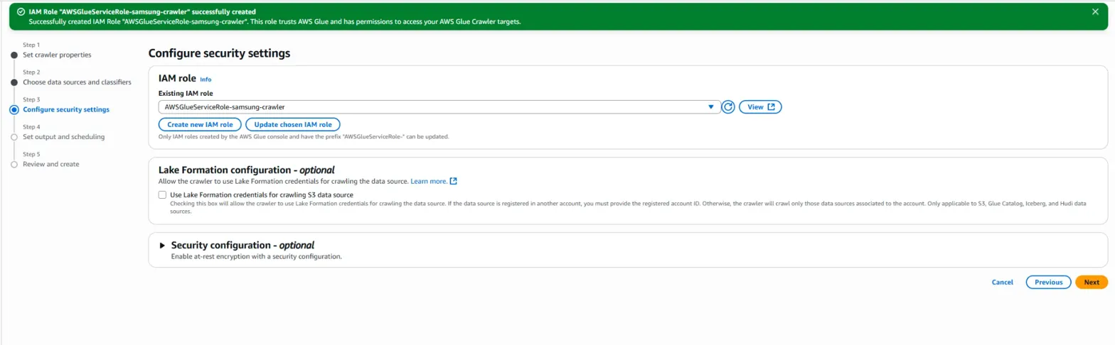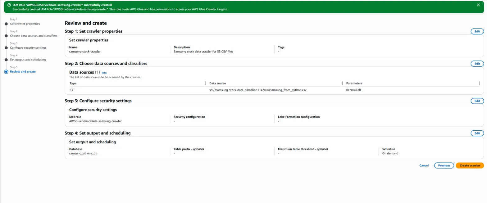 제대로 잘 설정되었는지 확인하고 'Create crawler' 주황색 버튼을 눌러 crawler를 생성합니다.