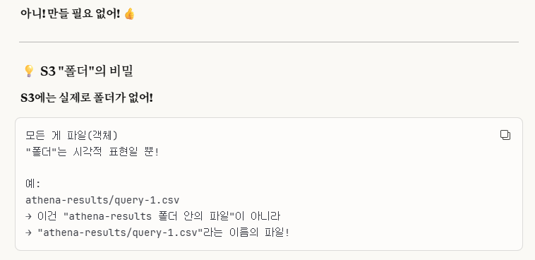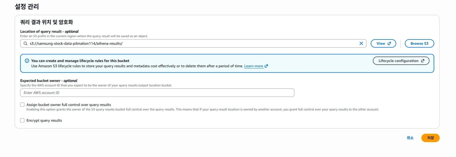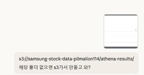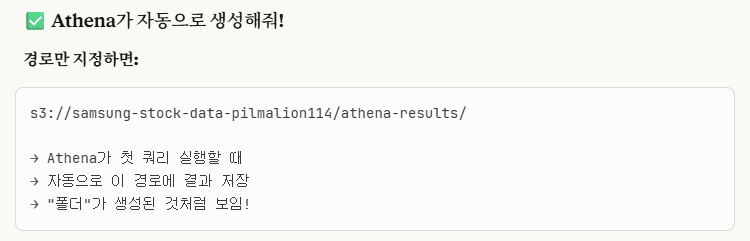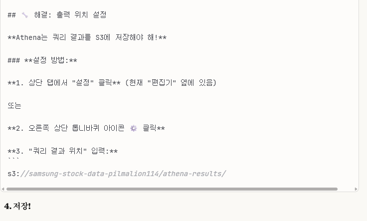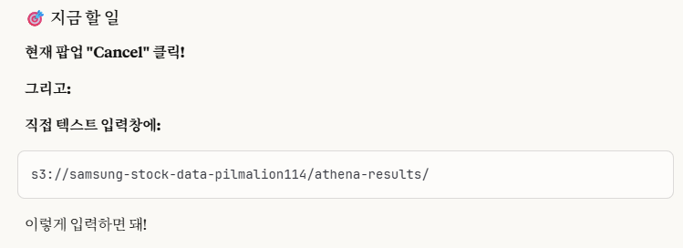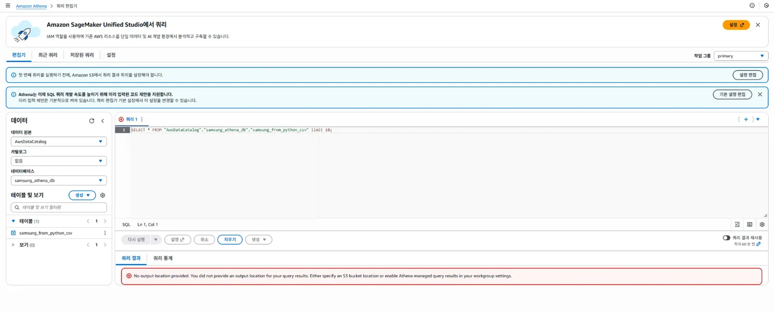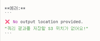 Athena는 쿼리 결과를 S3에 저장해야 하는데, 우리가 그 설정을 안 해서 이런 오류가 뜬 것입니다.