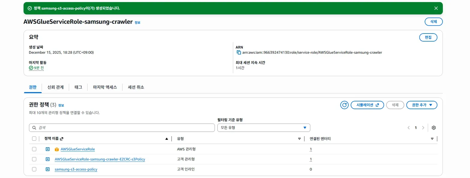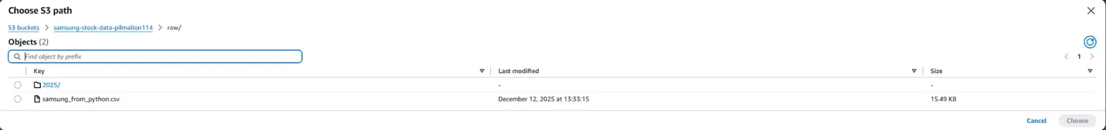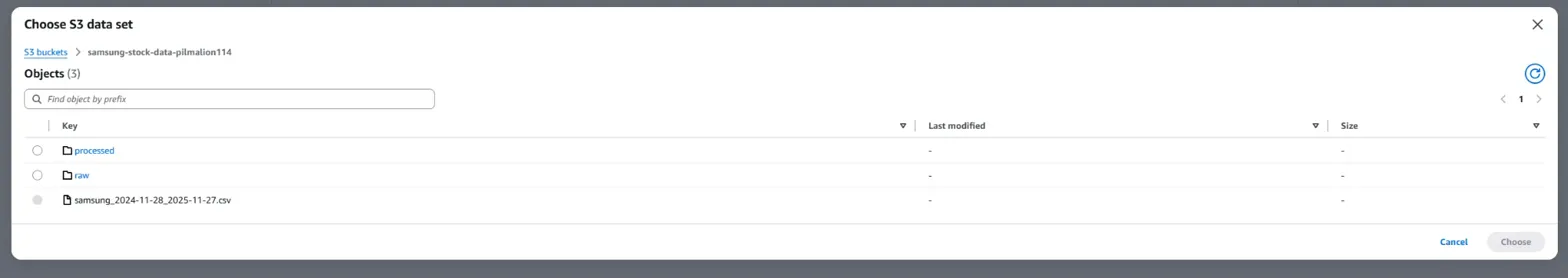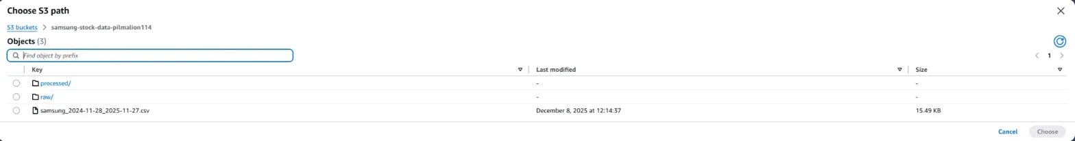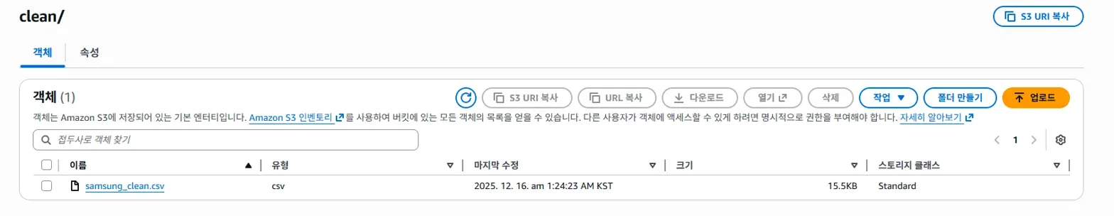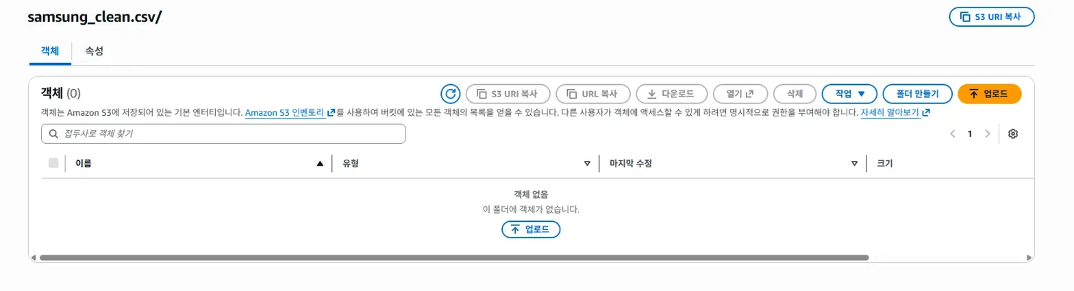 그 다음은 S3 버킷에서 raw/ 폴더에 'samsung_clean.csv' 파일을 새로 업로드하고,