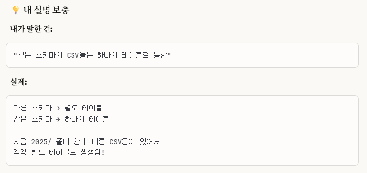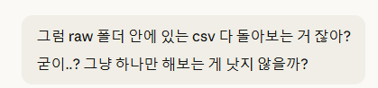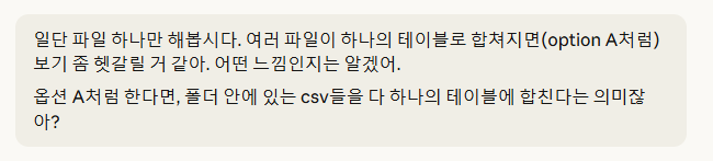 이것도 후반부에 보면 알겠지만, 폴더 안에 있는 csv들을 하나의 테이블에 합치는 경우와 그렇지 않고 개별적으로 나누는 기준이 있습니다.
