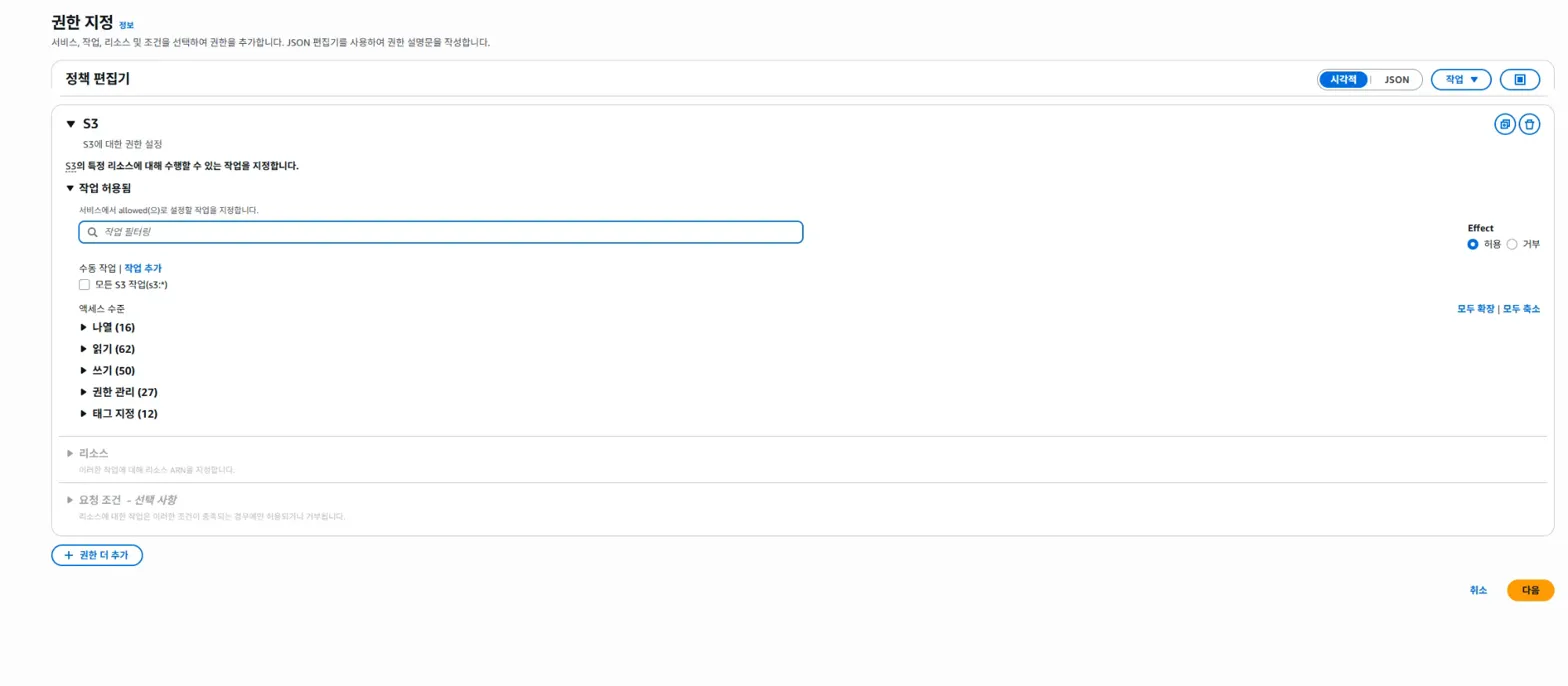 읽기 토글에서 'Getobject(파일 읽기)'를, 나열 토글에서 'ListBucket(버킷 안에 있는 파일 목록들 보기)'를 선택해서 활성화시켜줍니다.