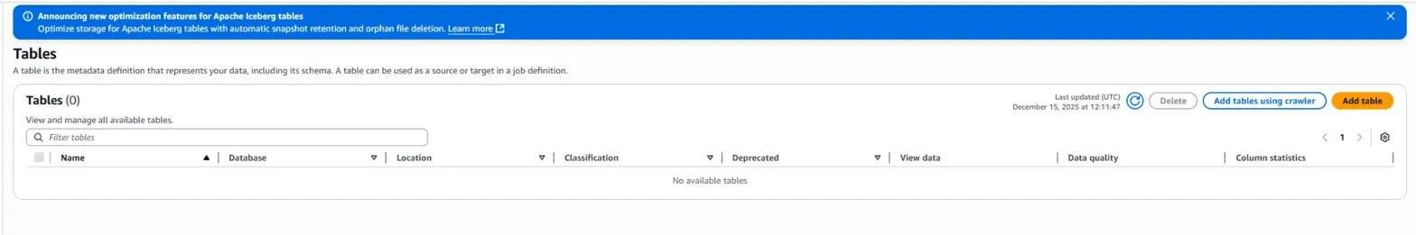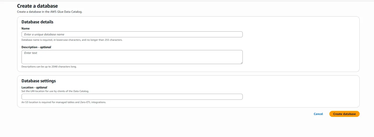 하지만 우리는 해당 Glue 서비스 내에는 데이터베이스를 생성한 것이 없죠.