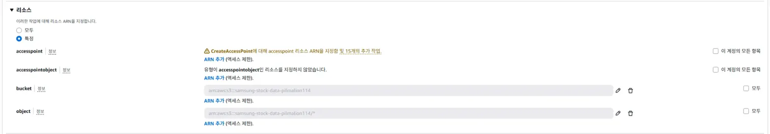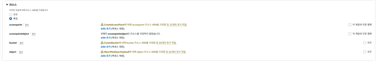 저는 이 때는 인라인 정책 권한 설정이 문제인지 알고 다시 폴더 -> 개별 파일로 경로를 변경해 진행했습니다.