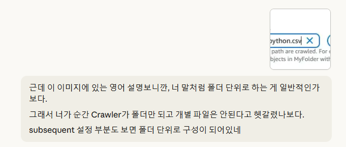 ('S3 버킷 경로에 포함된 모든 폴더들(sub folders)과 파일들이 crawl(크롤링, 단어 자체의 의미는 '긁어내다.' 입니다. 즉, 데이터를 긁어오는 것입니다.)합니다.)