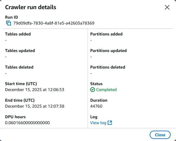 맨 위 오른쪽에 'run crawler' 버튼을 눌러 크롤링을 진행합니다.