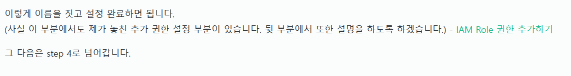 (사실 이 부분에서도 제가 놓친 추가 권한 설정 부분이 있습니다. 뒷 부분에서 또한 설명을 하도록 하겠습니다.) - IAM Role 권한 추가하기