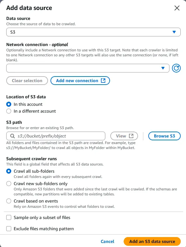 1.Data Sources는 무조건 폴더로 설정하기! -> Crawler가 자동으로 폴더로 인식하게끔 설정이 되어 있음.