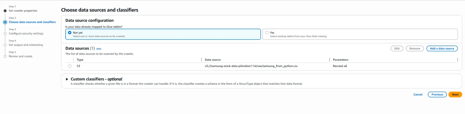 Data source는 우리는 S3 버킷에서 가져올 것이니 S3로 설정하고