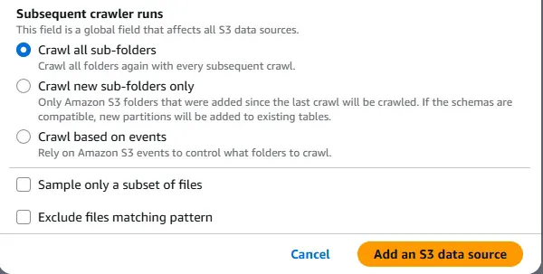 그 다음 설정은 우리가 지정한 S3 경로 안에 sub folder들을 어떻게 crawl할 것인지 설정하는 부분입니다.