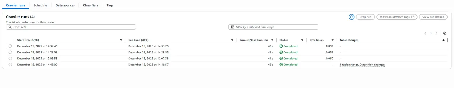 밑에 Crawler runs에 진행상황 표시가 나옵니다.
