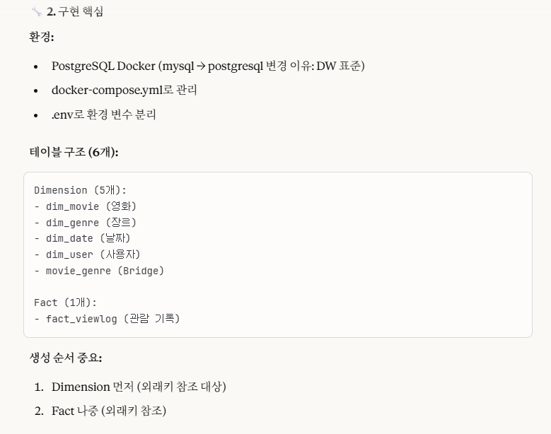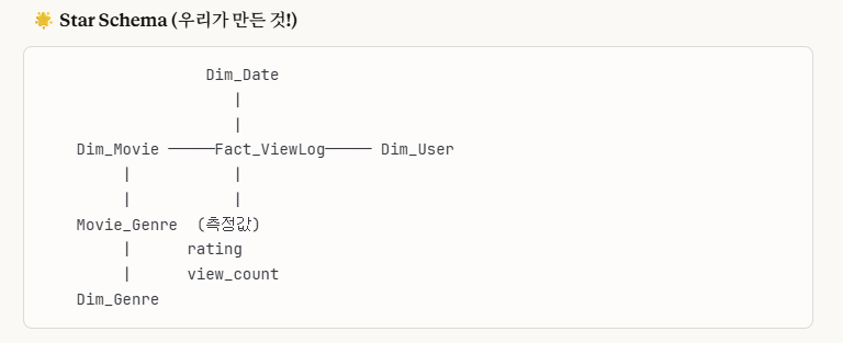 # psql -U movie_user -d movie_dw psql (16.11 (Debian 16.11-1.pgdg13+1)) Type "help" for help. movie_dw=# \dt List of relations Schema | Name | Type | Owner --------+--------------+-------+------------ public | dim_date | table | movie_user public | dim_genre | table | movie_user public | dim_movie | table | movie_user public | dim_user | table | movie_user public | fact_viewlog | table | movie_user public | movie_genre | table | movie_user (6 rows) movie_dw=# select * from fact_vielog limit 5; ERROR: relation "fact_vielog" does not exist LINE 1: select * from fact_vielog limit 5; ^ movie_dw=# select * from fact_viewlog limit 5; view_id | movie_id | user_id | view_date | rating | view_count | created_at ---------+----------+---------+------------+--------+------------+---------------------------- 301 | 798645 | 11 | 2024-01-05 | 2.8 | 1 | 2025-12-28 21:27:54.482979 302 | 1180831 | 4 | 2024-05-14 | 2.7 | 1 | 2025-12-28 21:27:54.482979 303 | 1286185 | 1 | 2025-02-18 | 6.2 | 2 | 2025-12-28 21:27:54.482979 304 | 1013446 | 4 | 2025-08-22 | 7.8 | 1 | 2025-12-28 21:27:54.482979 305 | 152760 | 16 | 2025-03-06 | 1.2 | 3 | 2025-12-28 21:27:54.482979 (5 rows) movie_dw=#movie_user와 movie_dw(data warehouse)는 yaml 파일에 설정되어있다.
