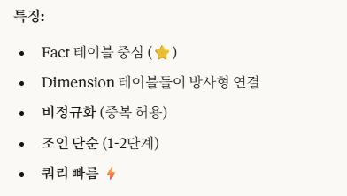 Star Schema는 Fact 테이블을 중심으로 Dimensional Table들이 방사형(중심에서 퍼져나가는 모양)으로 연결된 구조입니다.