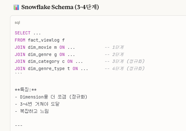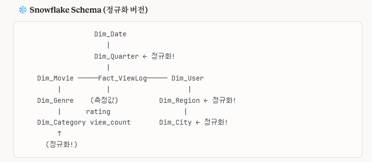 Snowflake Schema는 Star Schema의 정규화 버전이라고 생각하면 됩니다.