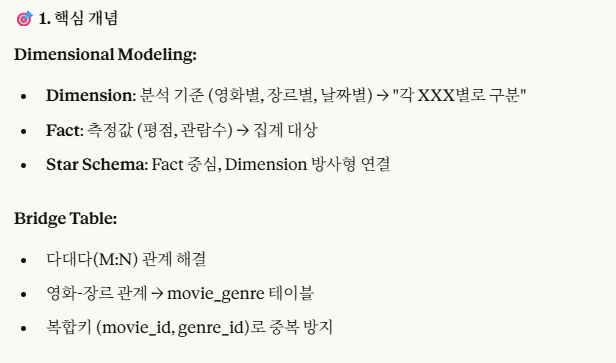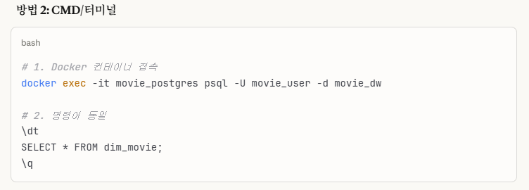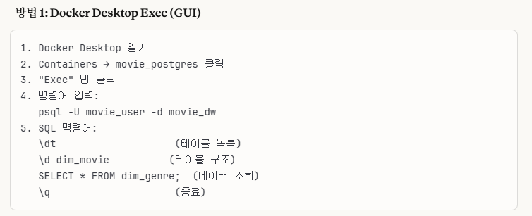 C:\Windows\System32>cd C:\Users\dc\Desktop\새로운 포트폴리오를 위한 폴더\데이터,AI\포트폴리오용\데이터 엔지니어링\실습\data_engineer_portfolio\phase 4\phase 4-1 C:\Users\dc\Desktop\새로운 포트폴리오를 위한 폴더\데이터,AI\포트폴리오용\데이터 엔지니어링\실습\data_engineer_portfolio\phase 4\phase 4-1>docker exec -it movie_postgres psql -U movie_user -d movie_dw psql (16.11 (Debian 16.11-1.pgdg13+1)) Type "help" for help. movie_dw=# \dt List of relations Schema | Name | Type | Owner --------+--------------+-------+------------ public | dim_date | table | movie_user public | dim_genre | table | movie_user public | dim_movie | table | movie_user public | dim_user | table | movie_user public | fact_viewlog | table | movie_user public | movie_genre | table | movie_user (6 rows) movie_dw=# select * from fact_viewlog limit 5; view_id | movie_id | user_id | view_date | rating | view_count | created_at ---------+----------+---------+------------+--------+------------+---------------------------- 301 | 798645 | 11 | 2024-01-05 | 2.8 | 1 | 2025-12-28 21:27:54.482979 302 | 1180831 | 4 | 2024-05-14 | 2.7 | 1 | 2025-12-28 21:27:54.482979 303 | 1286185 | 1 | 2025-02-18 | 6.2 | 2 | 2025-12-28 21:27:54.482979 304 | 1013446 | 4 | 2025-08-22 | 7.8 | 1 | 2025-12-28 21:27:54.482979 305 | 152760 | 16 | 2025-03-06 | 1.2 | 3 | 2025-12-28 21:27:54.482979 (5 rows) movie_dw=#똑같이 나온다.