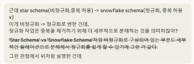 즉, Star Schema(비정규화) vs Snowflake Schema(정규화) 이렇게 비교해서 이해하면 됩니다.