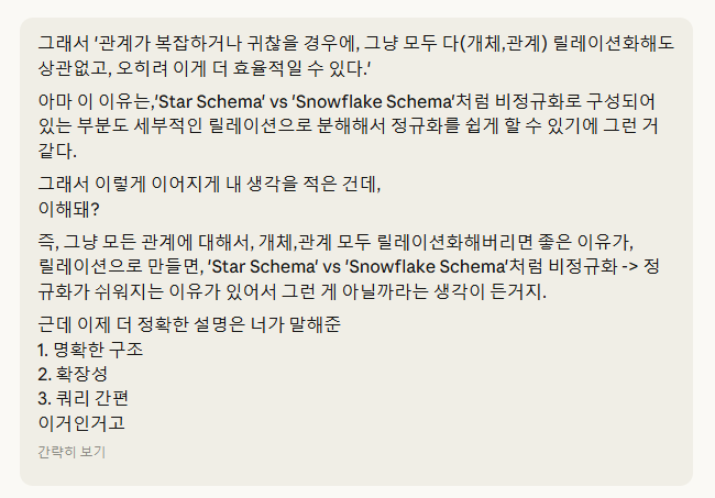 'Star Schema' vs 'Snowflake Schema'처럼 비정규화로 구성되어 있는 부분도 세부적인 릴레이션으로 분해해서 정규화를 쉽게 할 수 있기에 그런 거 같다.