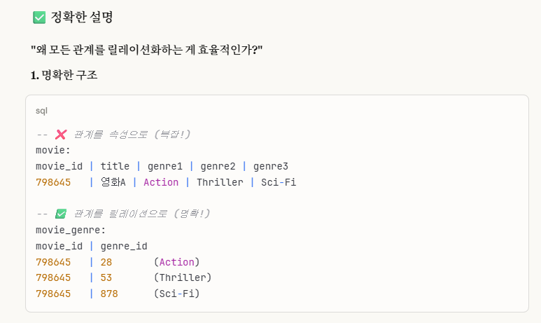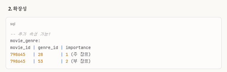 - 한 개의 장르는 여러 개의 영화에 포함될 수 있다.(1:N)