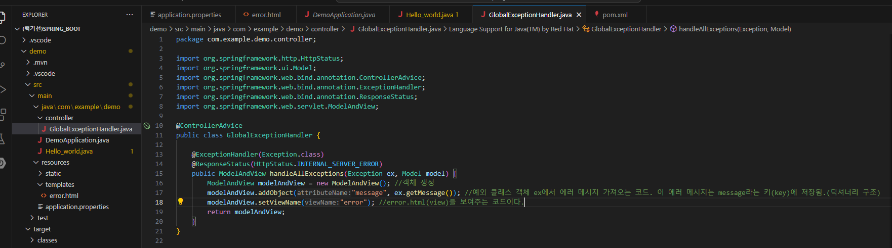 ->@controllerAdvice는 모든 예외(에러)에 대해 전역적으로 처리하는 기능을 가지고 있다! 이를 이용해서 /error 페이지를 대신 처리해주는 것이다.