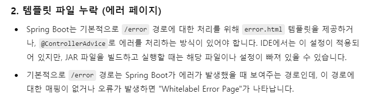 ->요약하자면, IDE(main문 돌리는 것)에는 /error 경로에 대한 것을 자동으로 제공해주지만, JAR 파일 빌드하고 실행할 때는 이런 거 안해주니, 너가 직접해라!!