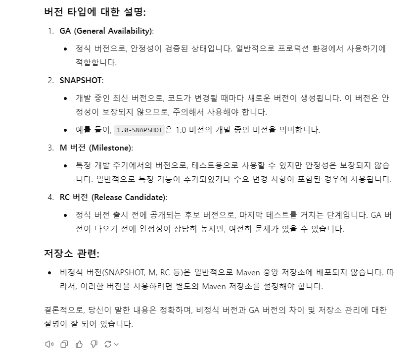 *스냅샷,M버전,RC 버전은 비정식 버전이라고 생각하면 됨. GA가 정식 버전임.