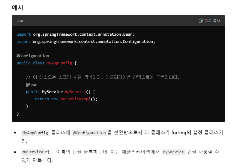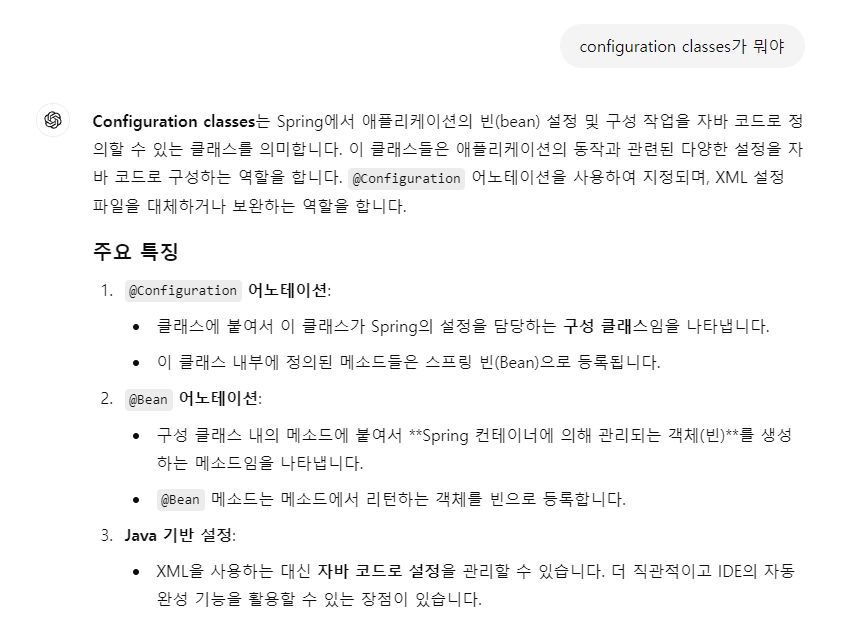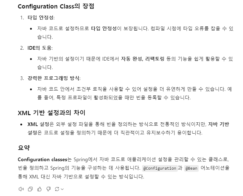 ->위에 있는 gpt 설명처럼, Configuration class -> XML or Java 기반으로 쓸 수 있는데, 이왕이면 같은 계열인 Java를 써라라는 의미이다.