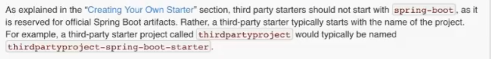 ->만약 자기만의 starter를 만들 때는, spring-boot로 시작하지 말고(이거는 spring boot 공식 starter 이므로), third-party starter project 이름을 먼저 기입한 후 spring-boot를 붙이라는 이야기임.