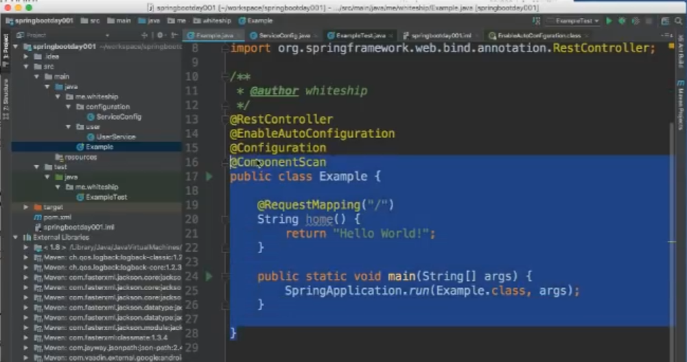 ->Example.java의 @ComponentScan이 자신이 속해 있는 me.whiteship 폴더(패키지) 하단 부분을 전부 scan해주는 역할을 한다.