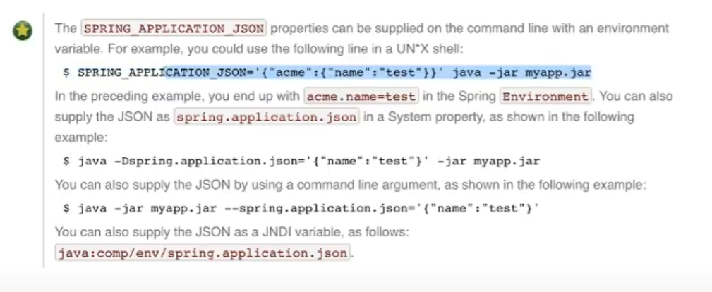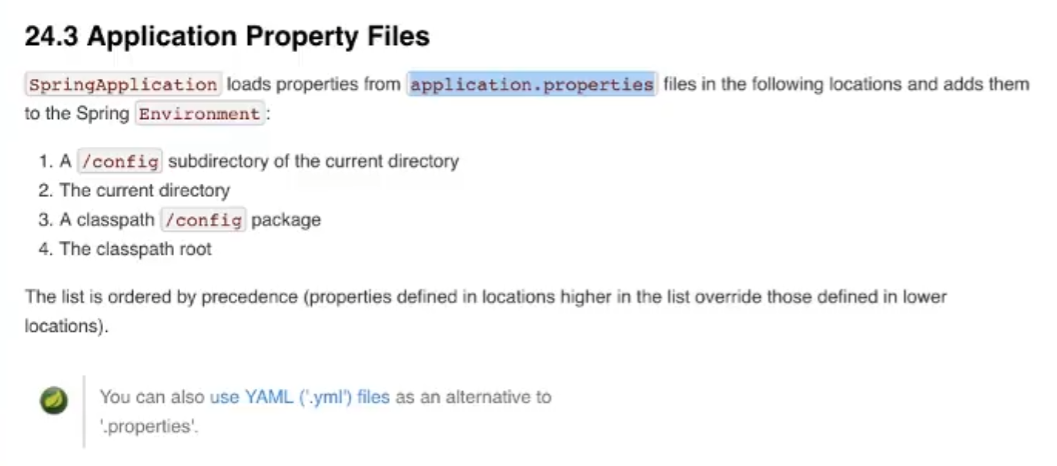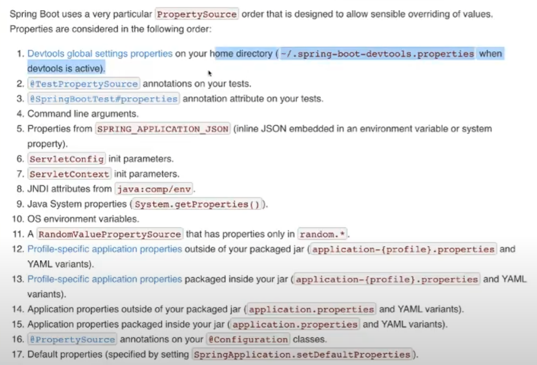 ->Command line arguments(4번), SPRING_APPLICATION_JSON(5번), System Properties(9번), OS environment variables(10번), Application Properties(12번부터~)을 말하셨음.