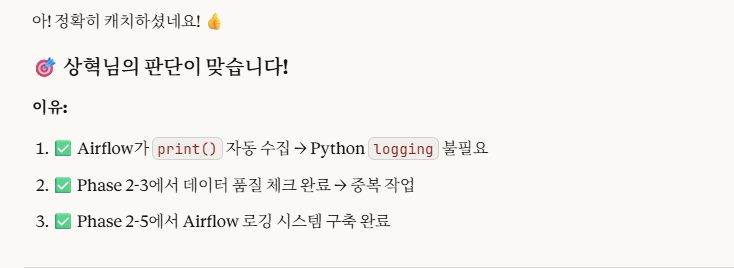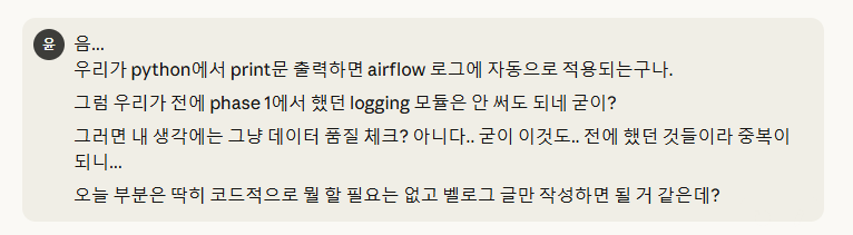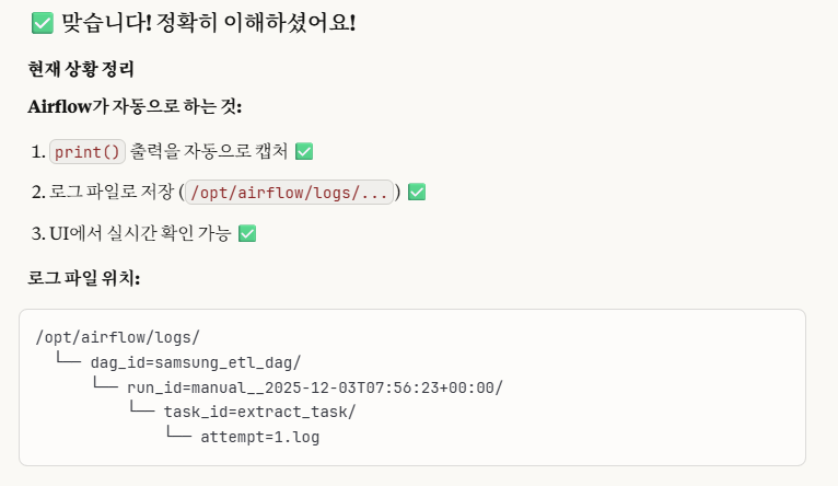 근데, 위 2번을 확인해보면, 우리가 코드에 작성한 print()문을 Airflow에서 로그로 직접 자동으로 적용시켜줌을 확인할 수 있습니다.