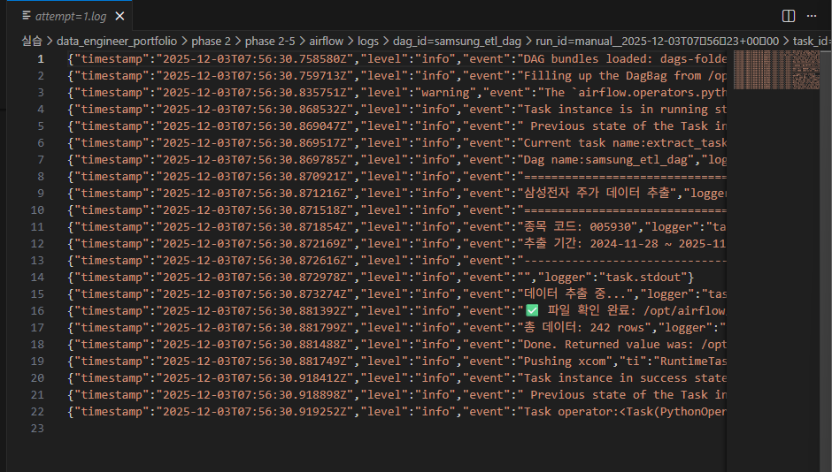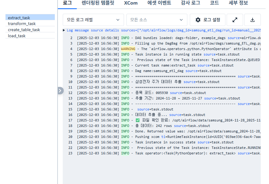이 경우에도 이미 Apache Airflow가 자동으로 알아서 로그 기록을 작성해주므로 pass하도록 하겠습니다.