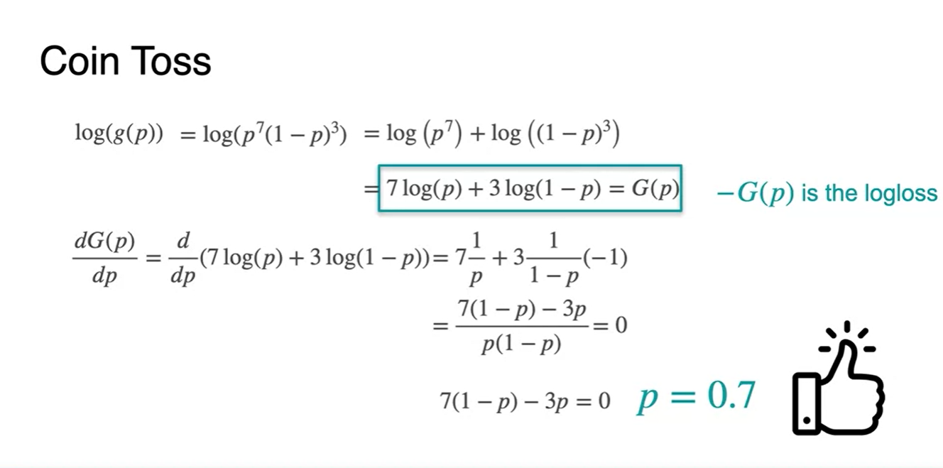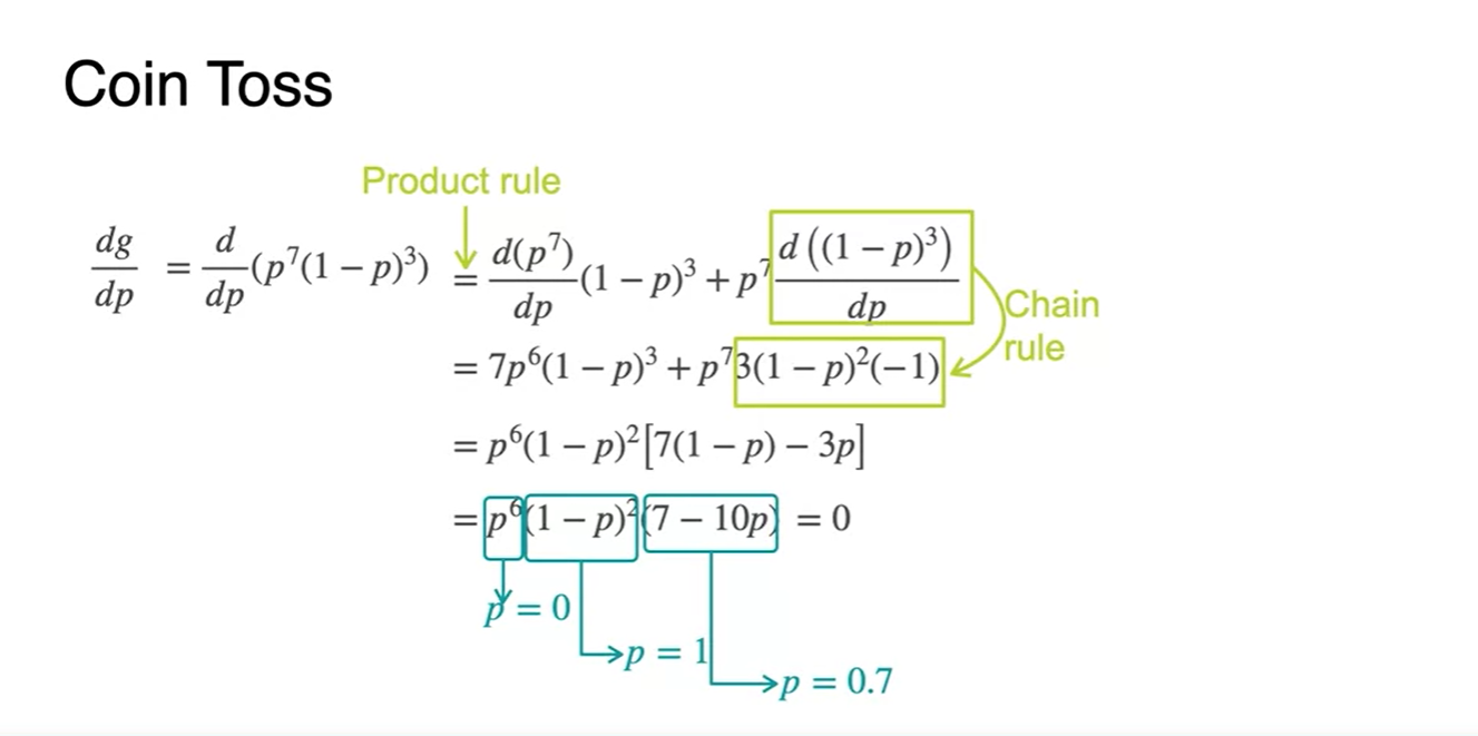 확률 를 변수로 하여 해당 수식의 최댓값을 찾기 위해 미분해보자.