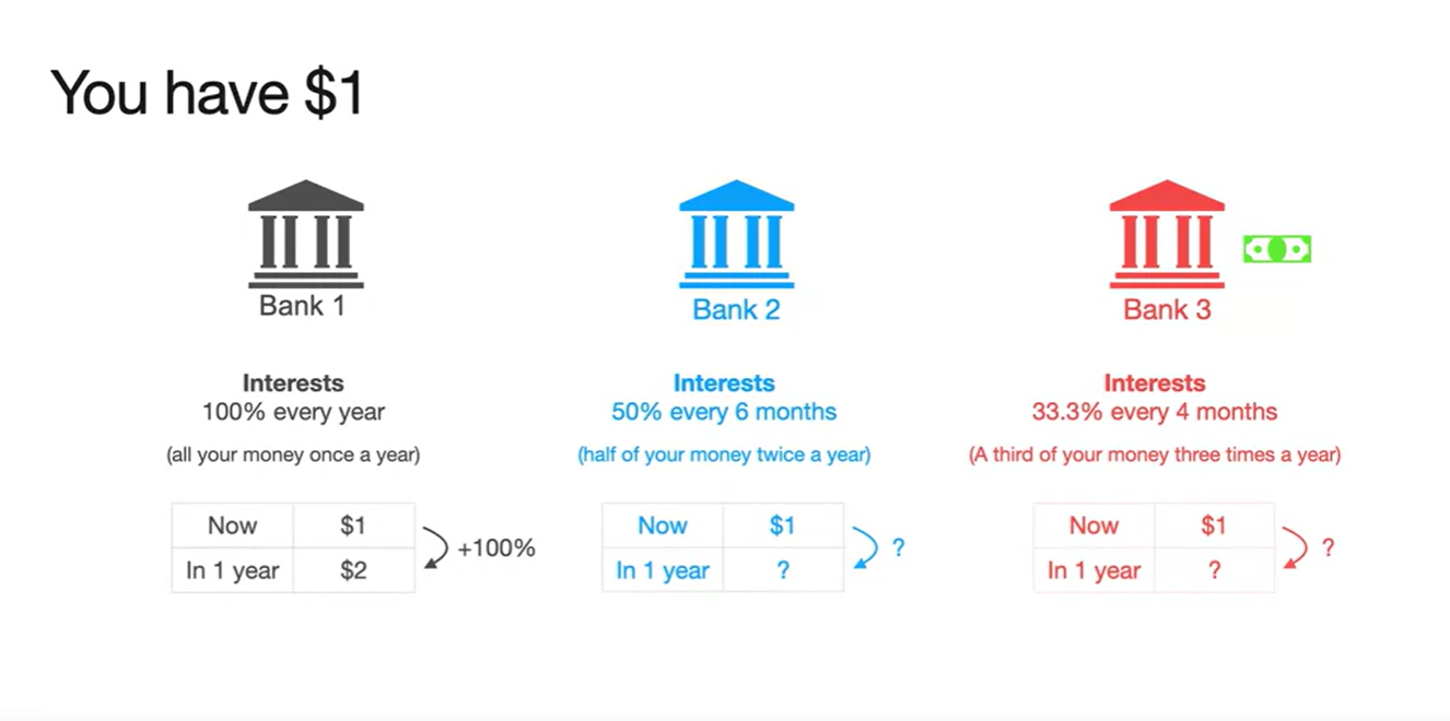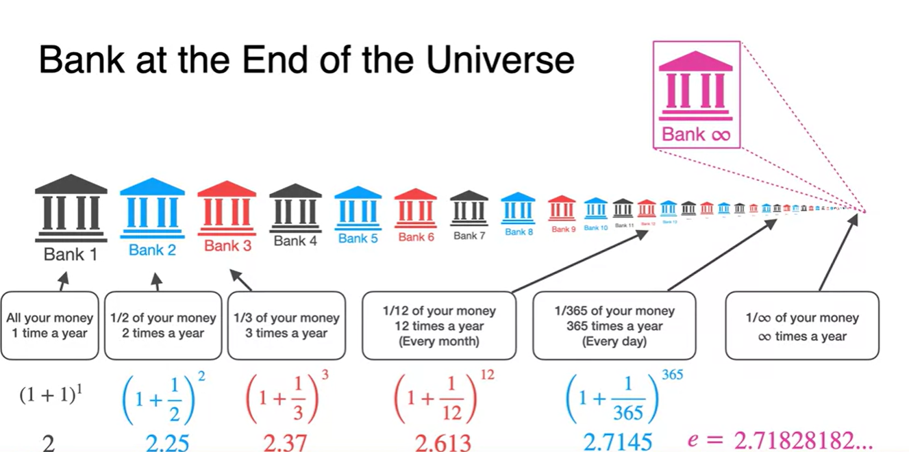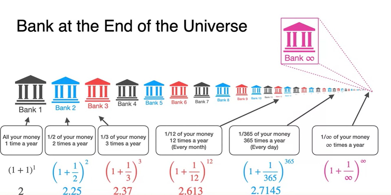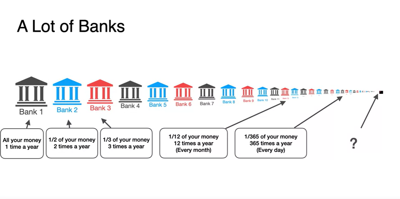 무수히 많은 은행에다가 원금 $1을 예치했다고 해보자.