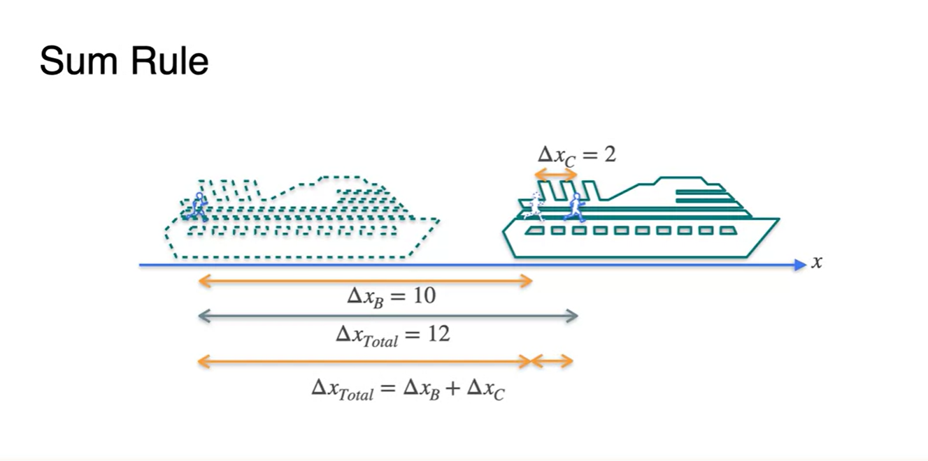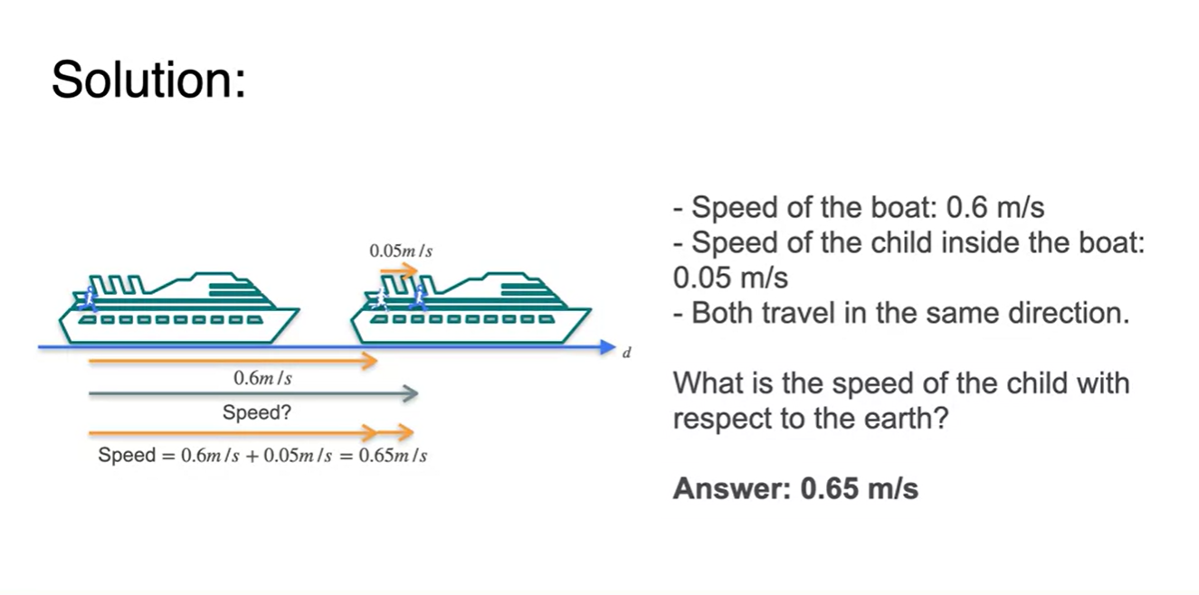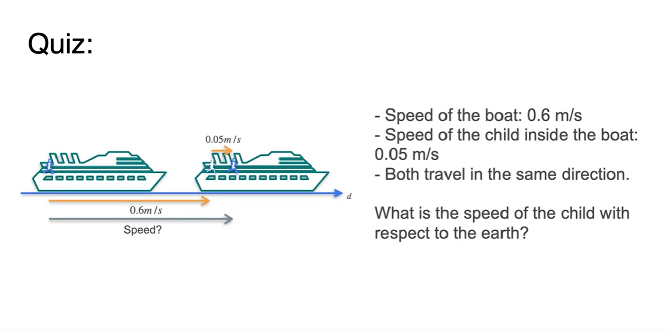 그렇다면 배와 사람의 속도가 주어졌을 때, 지구에서 본 배 위에 올라탄 사람의 (상대)속도는 얼마일까?