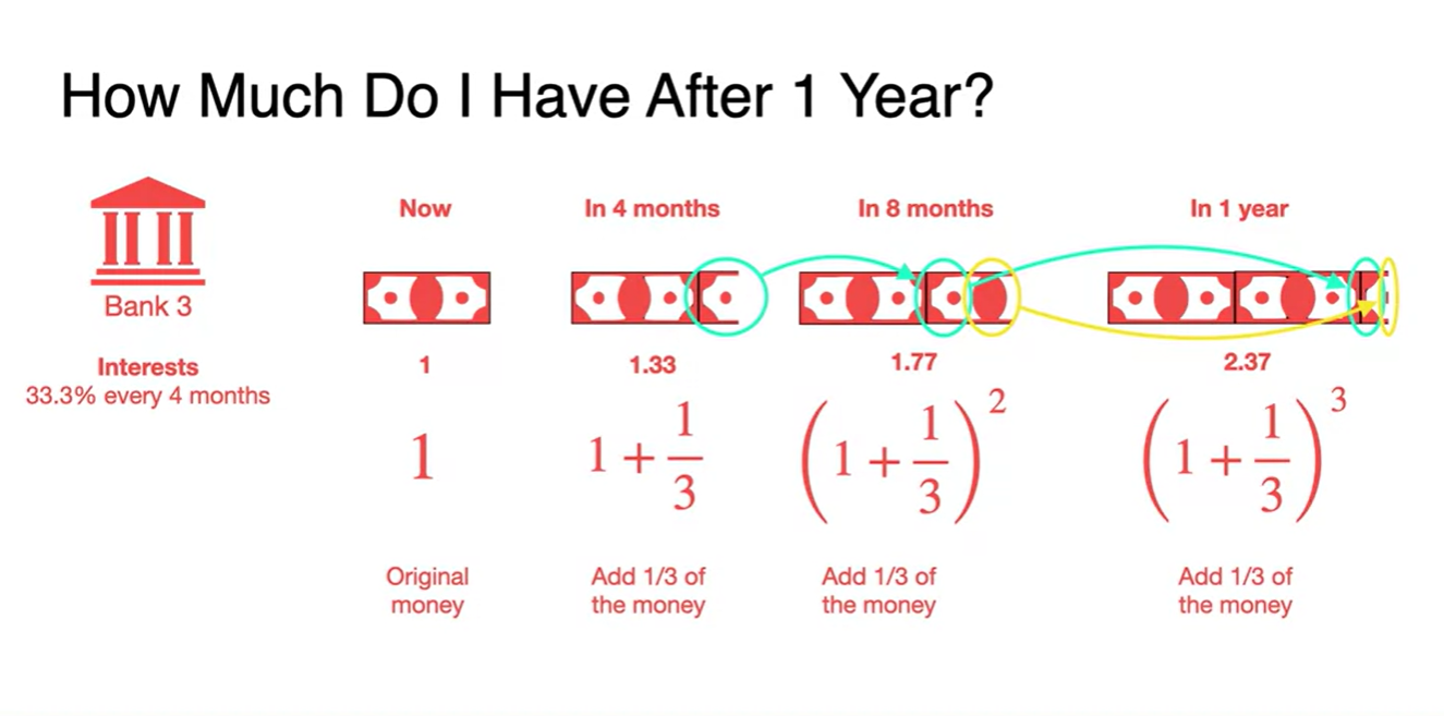 Bank3에 $1를 넣으면 1년 뒤에는 의 이자를 받는다.