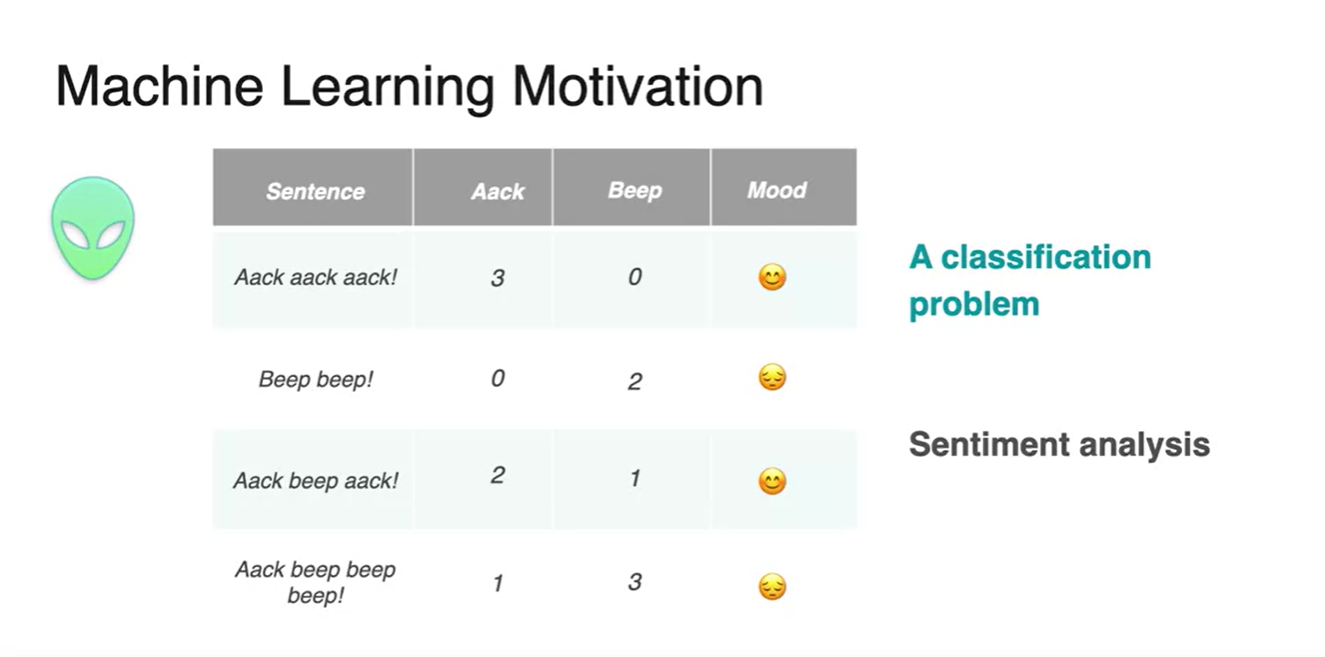 예를 들어, 외계인의 언어가 다음과 같이 단어의 등장 횟수를 표로 정리할 수 있고 그 때의 기분이 두 분류로 나뉜다고 해보자.